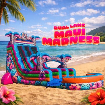 This eye-catching tropical slide combo features dual racing lanes, a large splash pool, and bold island-inspired designs that make it the centerpiece of any party. Whether you're hosting a summer birthday bash or a backyard luau, Maui Madness delivers big thrills with bright, beachy vibes.